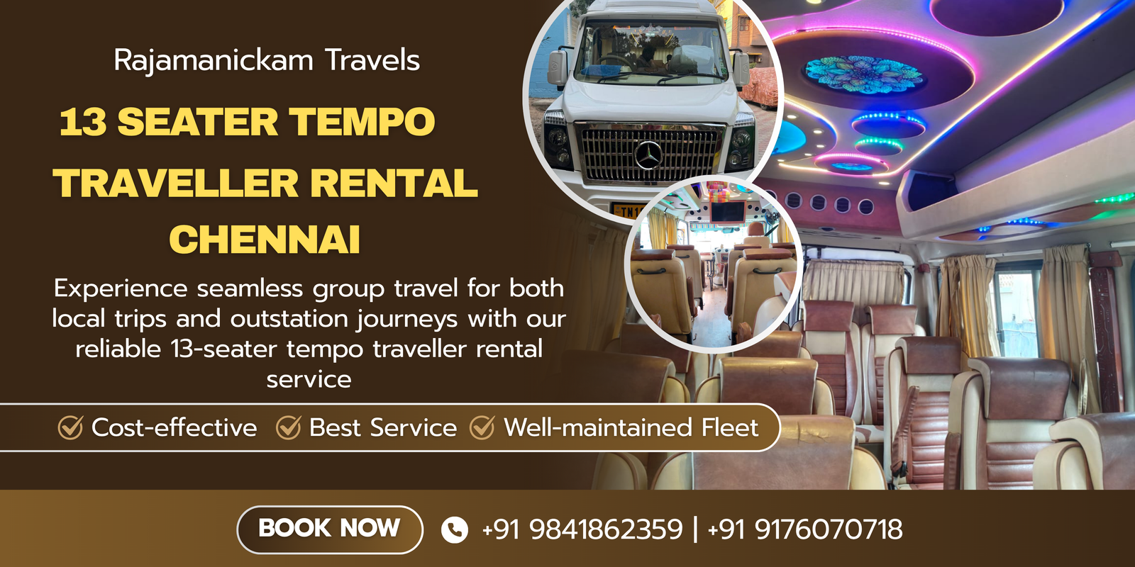 Tempotravellerrentalschennai.com Arranges 13 Seater Tempo Traveller Rental Chennai. Online 13 seater Tempo Traveller Rental for Chennai Local, Airport Transfer, Outstation Trips, Holiday Packages Best Deal and Discounted Price. Tariff starts 13 Seater AC Tempo Traveller Outstation per km Rate in Chennai Rs.22/-. For Booking 13 Seater Tempo Traveller Van Rental in Chennai PL Call or Whats app: +91 9176070718